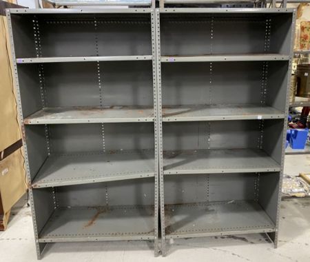 Two Metal Storage Shelves, bolted together, four shelf each, 71"h., 6'wide. Two Metal Storage Shelves, bolted together, four shelf each, 71"h., 6'wide.