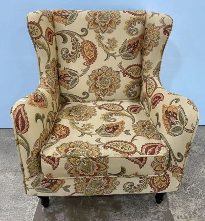 Modern Upholstered Arm Chair, floral pattern, has stain on seat cushion. Modern Upholstered Arm Chair, floral pattern, has stain on seat cushion.