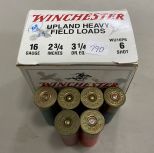 Winchester Upland Heavy Field Load 16 ga, has 19 in box, and Five Miscellaneous 12 ga. shell. Winchester Upland Heavy Field Load 16 ga, has 19 in box, and Five Miscellaneous 12 ga. shell.