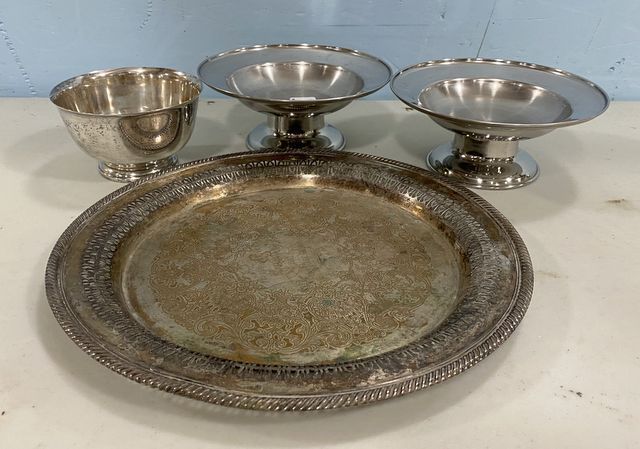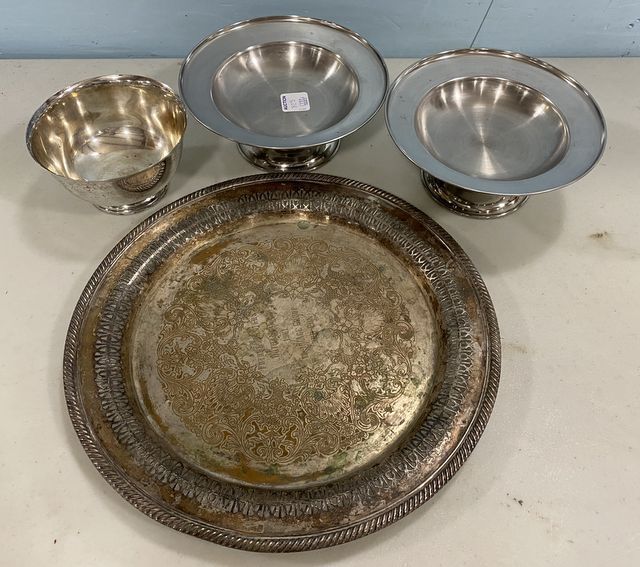 825 Silver Plate Round Tray, Two Compote, and Bowl