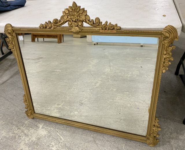 Antique Gold Gilt Mirror, Carved crest and sides, 34"h., 39"w., is missing some side trim. Antique Gold Gilt Mirror, Carved crest and sides, 34"h., 39"w., is missing some side trim.