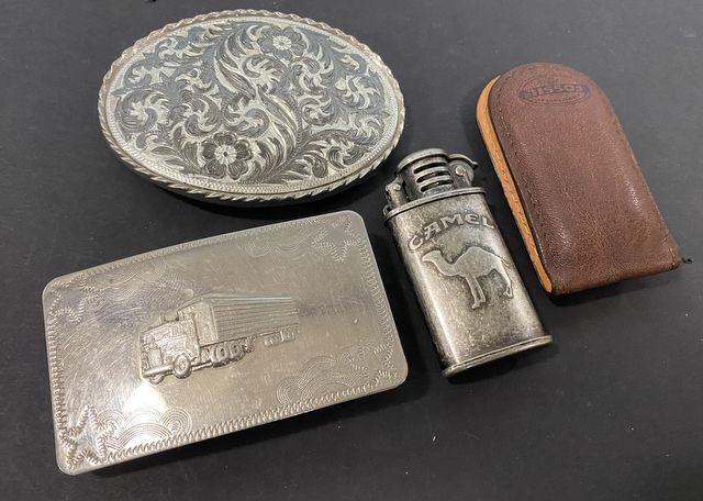 Leather Clip, Camel Lighter, Two Silver Color Belt Buckles Leather Clip, Camel Lighter, Two Silver Color Belt Buckles