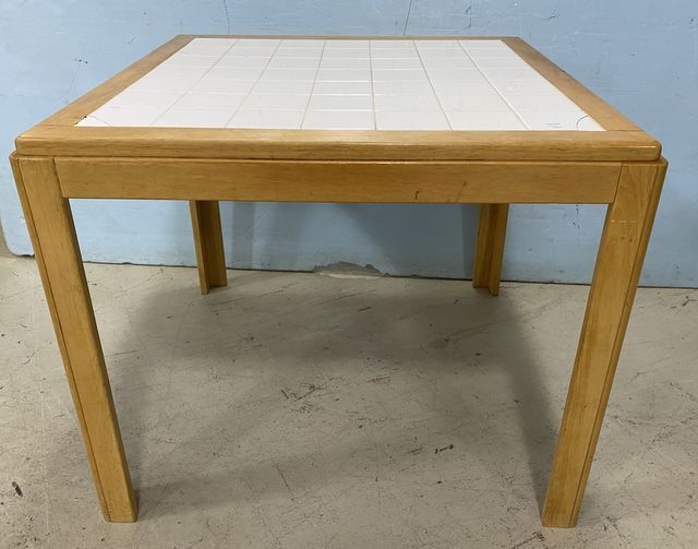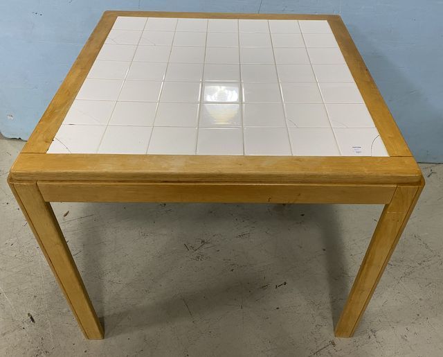 Square Wood and Tile Kitchen Table, white tile, some with cracks, one leg needs tightening, 30"h., 35"w Square Wood and Tile Kitchen Table, white tile, some with cracks, one leg needs tightening, 30"h., 35"w