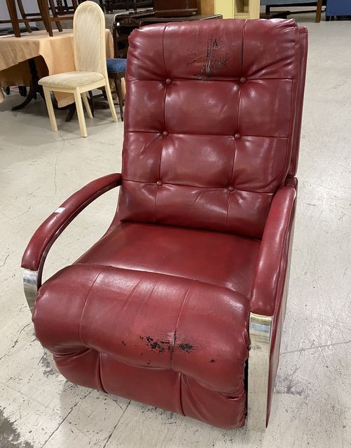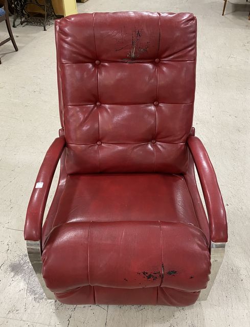 Mid Century Style Maroon Recliner, vinyl and stainless frame, pull handle recliner, has usage cracks. Mid Century Style Maroon Recliner, vinyl and stainless frame, pull handle recliner, has usage cracks.