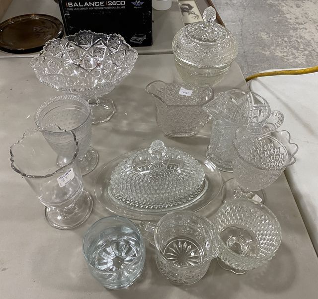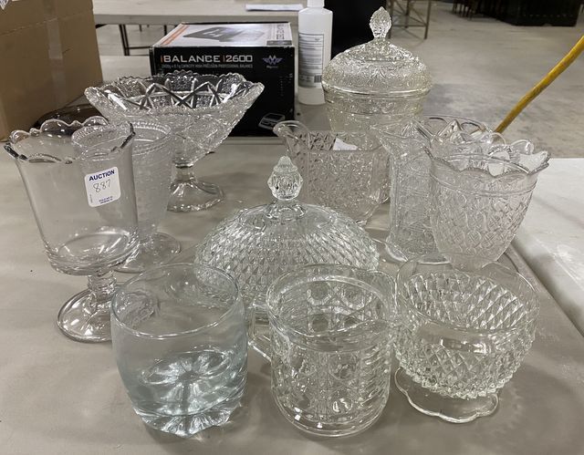Group of Pressed Depression Glass Pieces, compote, pitcher, cups, candy dish. Group of Pressed Depression Glass Pieces, compote, pitcher, cups, candy dish.