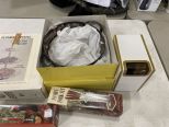 923 Crystal Three Tier Server, Silver Plate Base, Box of Cups, Two Fondue Fork Sets.