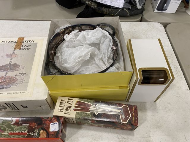Crystal Three Tier Server, Silver Plate Base, Box of Cups, Two Fondue Fork Sets. Crystal Three Tier Server, Silver Plate Base, Box of Cups, Two Fondue Fork Sets.
