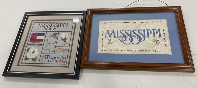 Two Mississippi Framed Needle Points, matted, framed, 10"h., 14"w. Two Mississippi Framed Needle Points, matted, framed, 10"h., 14"w.