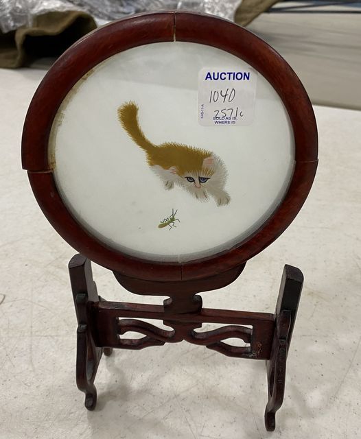 Chinese Hand Embroidered Silk Cat Double Sided Convex Glass Table Screen, small, has some wear, 9"h. Chinese Hand Embroidered Silk Cat Double Sided Convex Glass Table Screen, small, has some wear, 9"h.