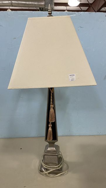 Contemporary Mirrored Table Lamp, silver color, shade, 32"h. one mirror panel has crack. Contemporary Mirrored Table Lamp, silver color, shade, 32"h. one mirror panel has crack.