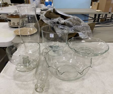 Group of Clear Glassware Pieces, footed bowl, crimped rim bowl, compotes, jar, and hurricane shade. Group of Clear Glassware Pieces, footed bowl, crimped rim bowl, compotes, jar, and hurricane shade.