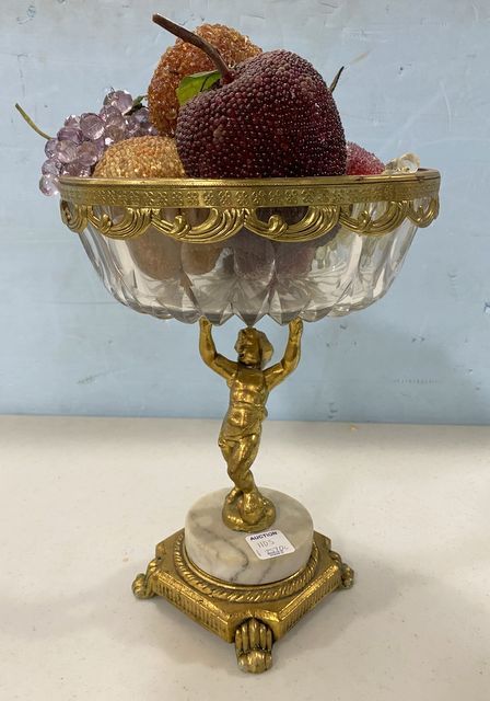 Gold Figural Centerpiece with Fruit, glass bowl, 11"h. Gold Figural Centerpiece with Fruit, glass bowl, 11"h.