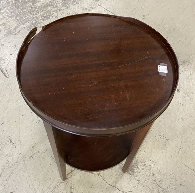 Round Mahogany Lamp Table, two tier, side trim has damage, 27"h., 18"dia. Round Mahogany Lamp Table, two tier, side trim has damage, 27"h., 18"dia.