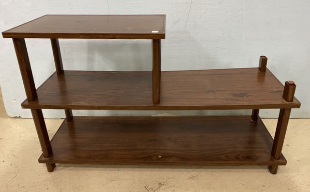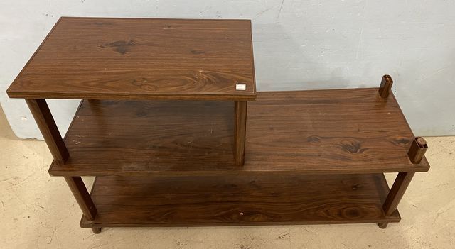 Vintage Pressed Wood Two Tier Table, dark oak finish, missing some attachments, 48"w., 16"h. Vintage Pressed Wood Two Tier Table, dark oak finish, missing some attachments, 48"w., 16"h.