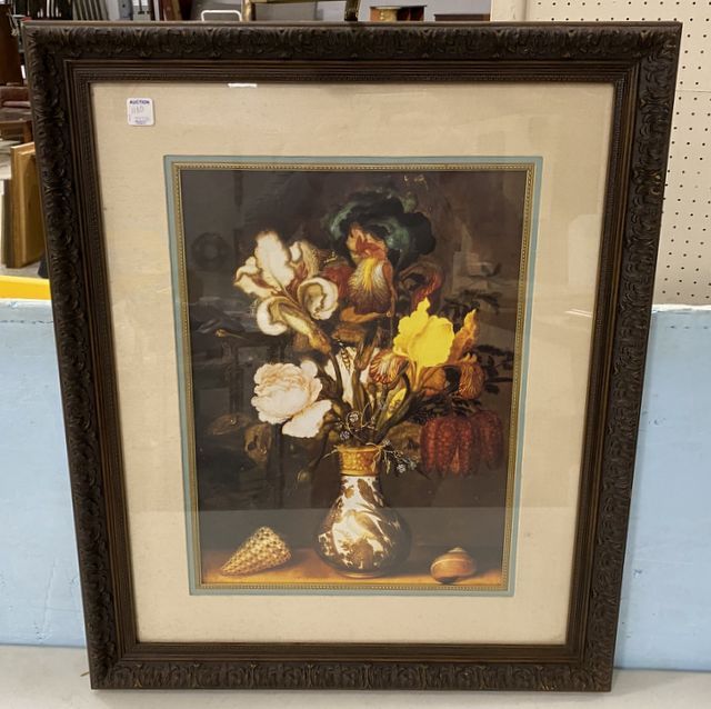 Framed Floral Still Life Print, matted, battery light, frame is 30"h., 24"w. Framed Floral Still Life Print, matted, battery light, frame is 30"h., 24"w.