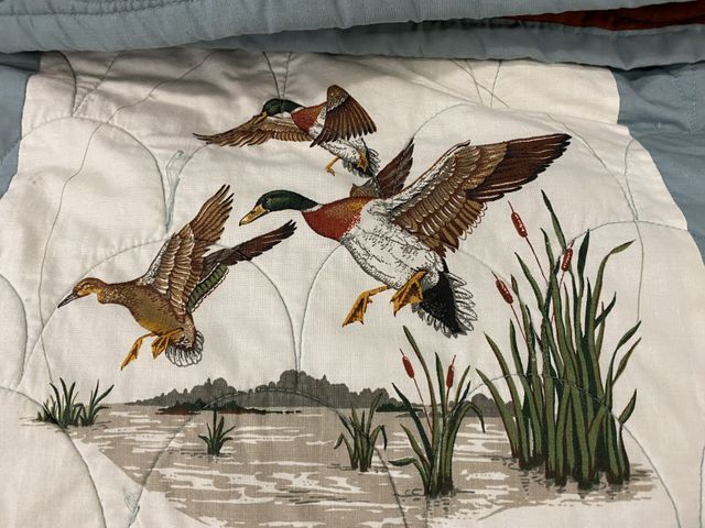 Hand Stitched Mallard Duck Quilt/spread, no damage. Hand Stitched Mallard Duck Quilt/spread, no damage.