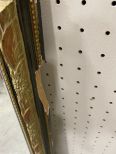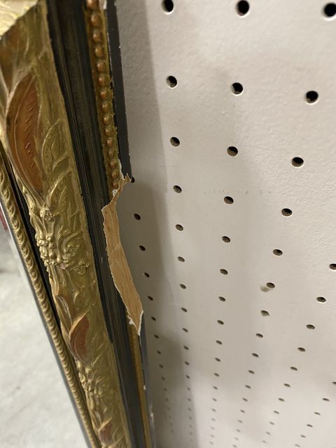 Black and Gold Framed Mirror, beveled, frame is chip on side, 41"h., 29"w. Black and Gold Framed Mirror, beveled, frame is chip on side, 41"h., 29"w.
