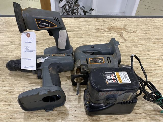 Three Piece POP Sander, Drill, Jig Saw, one battery and charger. Three Piece POP Sander, Drill, Jig Saw, one battery and charger.