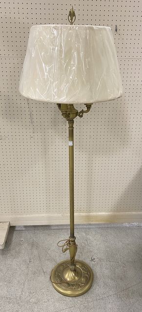 Vintage Brass Three Arm Floor Lamp, frosted glass torchiere shade, and white shade, 62"h. Vintage Brass Three Arm Floor Lamp, frosted glass torchiere shade, and white shade, 62"h.