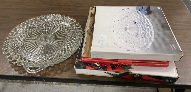 American Whitehall cake plate, Christmas platter, Hostess Platter, two pressed platters. American Whitehall cake plate, Christmas platter, Hostess Platter, two pressed platters.