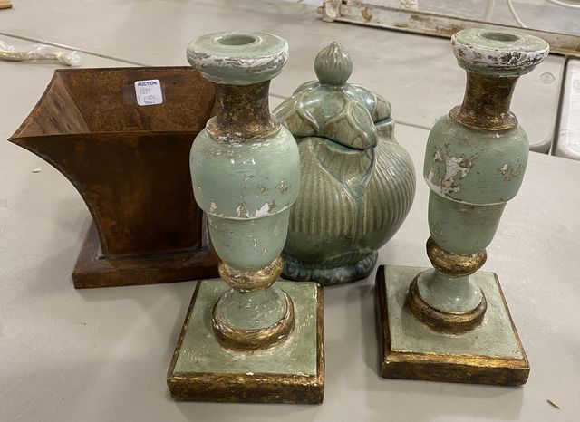 Antiqued Painted Candle Sticks, Ceramic Urn, Rustic Metal Planter. Antiqued Painted Candle Sticks, Ceramic Urn, Rustic Metal Planter.