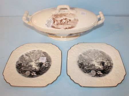 296 Brown Transfer ware Casserole Dish, Two English Black and White Transfer ware Plates