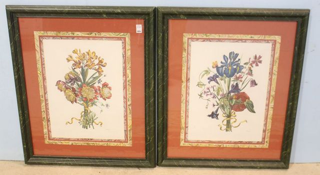 Floral prints with marble design matting and frame; 27" w., 34" h. Floral prints with marble design matting and frame; 27" w., 34" h.