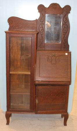 Shelves on one side, original finish, broken carving on top; 35" w., 13 1/2" d., 70" h. Shelves on one side, original finish, broken carving on top; 35" w., 13 1/2" d., 70" h.