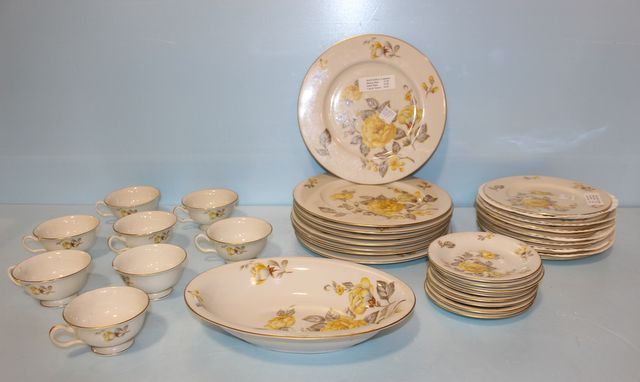 Includes eight dinner plates, eight salad plates, eight cups, eight saucers, vegetable bowl; one cup chipped; 33 pieces total Includes eight dinner plates, eight salad plates, eight cups, eight saucers, vegetable bowl; one cup chipped; 33 pieces total