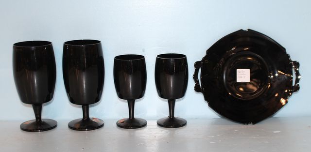 581 Four Reizart Gorham Black Glass Glasses and Black Glass Handled Tray