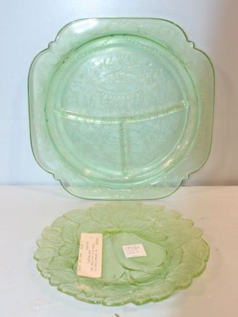 597 "Avocado" Pear and Leaf Plate, Green Depression Glass Divided Plate