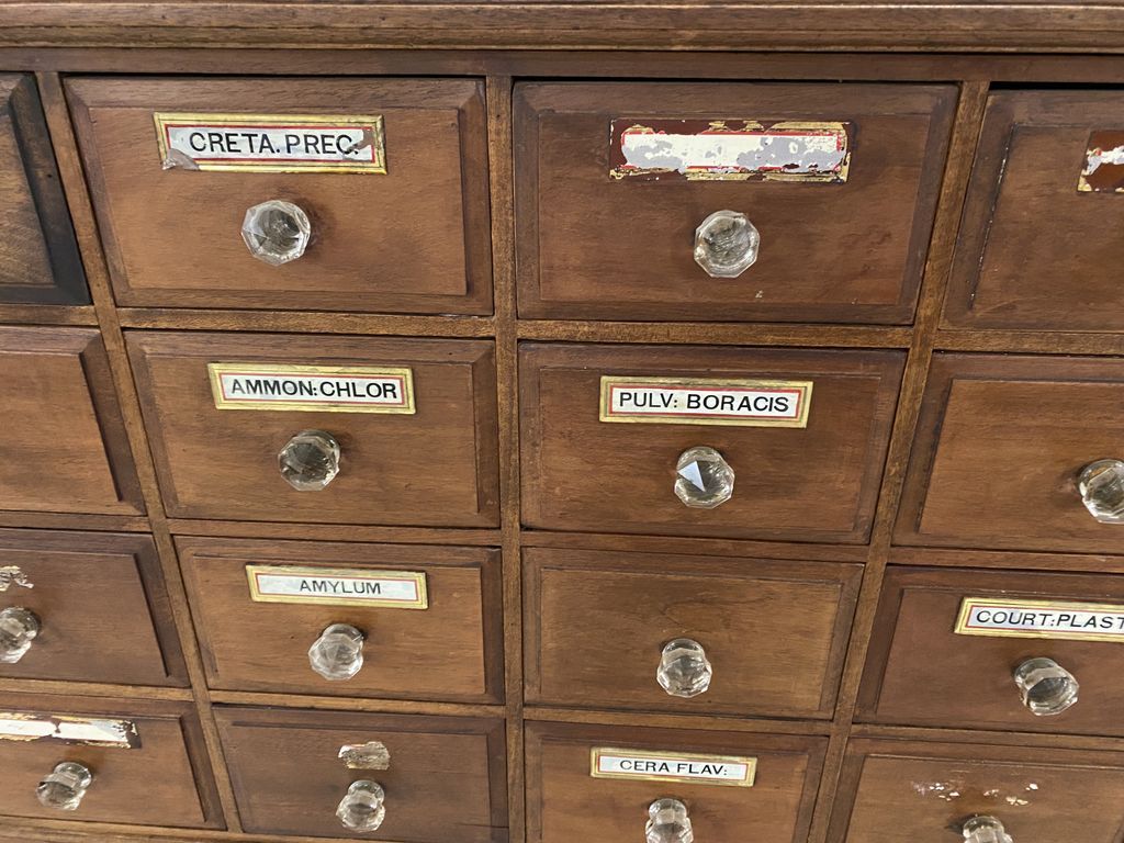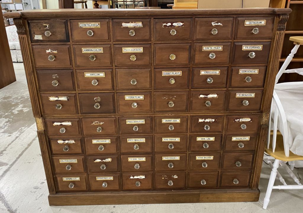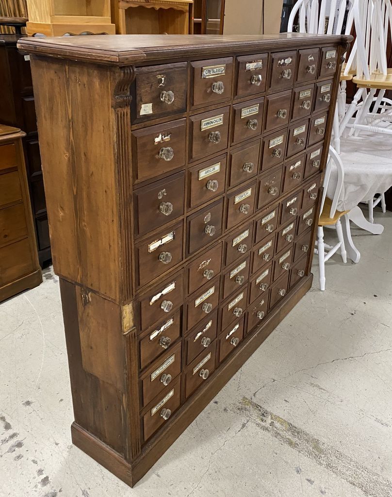 Apothecary Pharmacy Organizing Cabinet, missing two trim pieces, two piece, 55"h., 64"w., 12"d. Location Right Side 3rd Row Apothecary Pharmacy Organizing Cabinet, missing two trim pieces, two piece, 55"h., 64"w., 12"d. Location Right Side 3rd Row