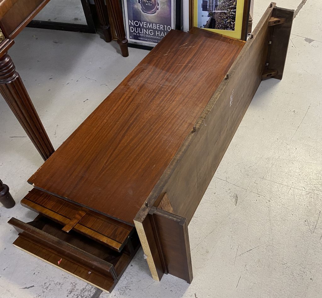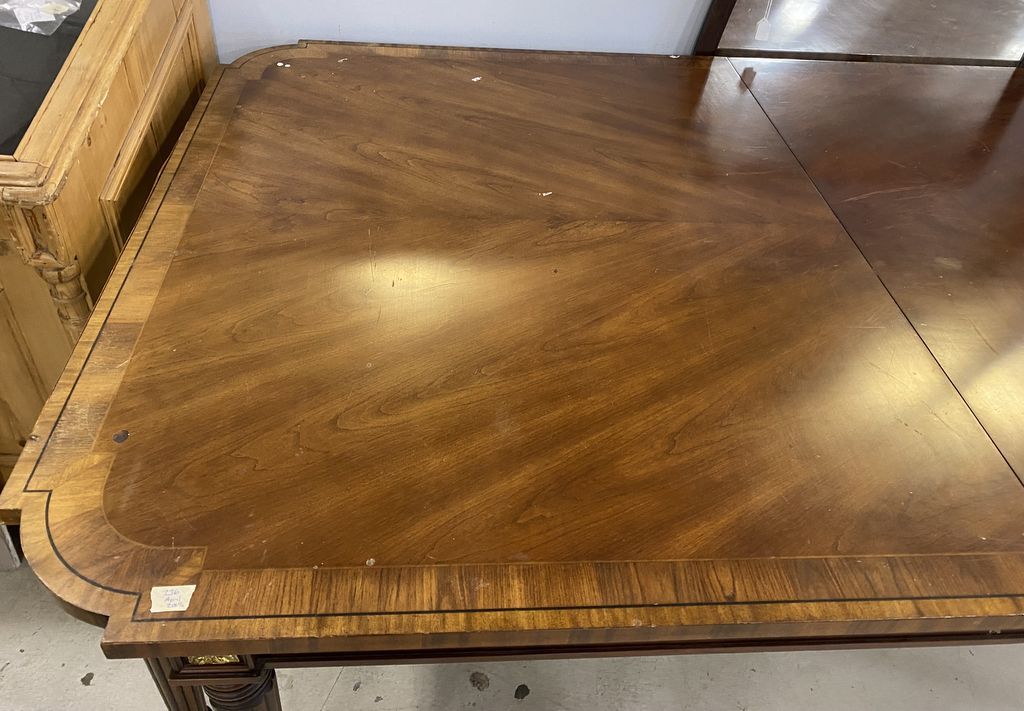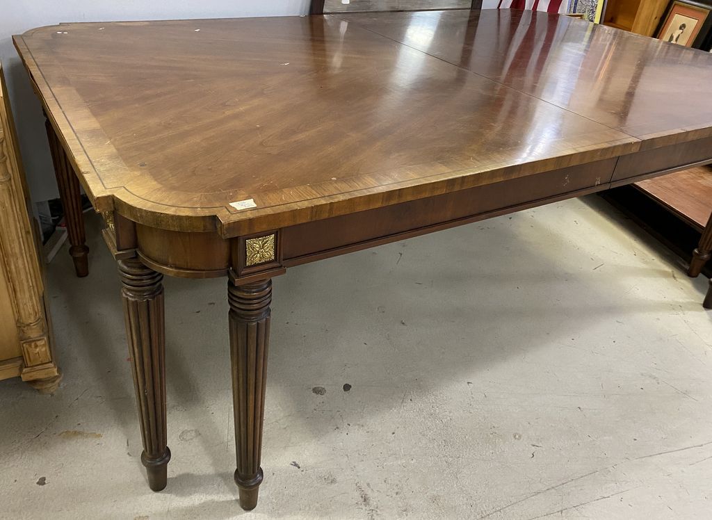 Statton Co. (North Carolina) Regency Style Mahogany Dining Table, has sun fading on finish, three leaves, 30"h. 84"long, 52"w. Statton Co. (North Carolina) Regency Style Mahogany Dining Table, has sun fading on finish, three leaves, 30"h. 84"long, 52"w.