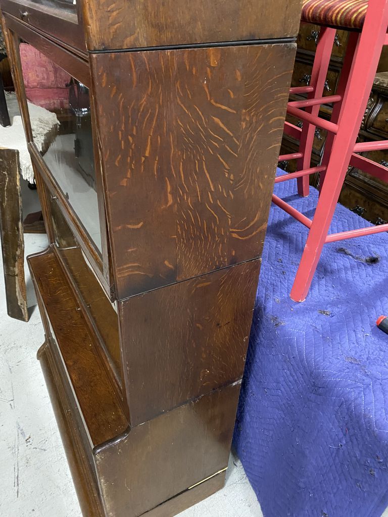 Vintage Oak Four Stack Barrister Bookcase, has wear, had light work done to it, is functional, 68"h., 34"w. 16"d. Location: Left Side 4th Row Vintage Oak Four Stack Barrister Bookcase, has wear, had light work done to it, is functional, 68"h., 34"w. 16"d. Location: Left Side 4th Row