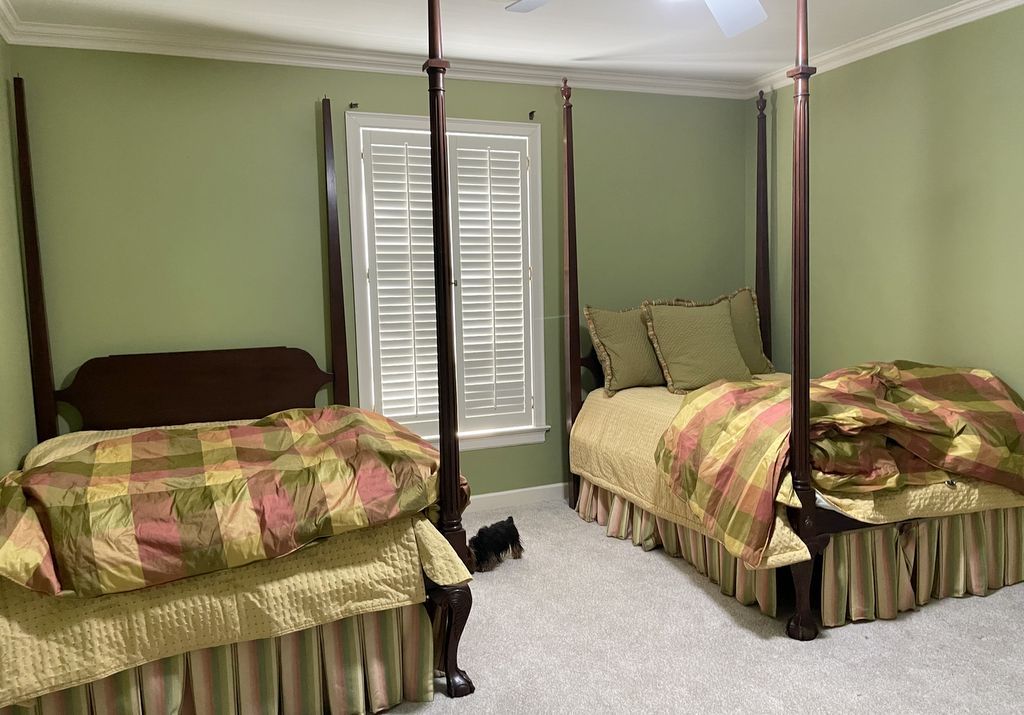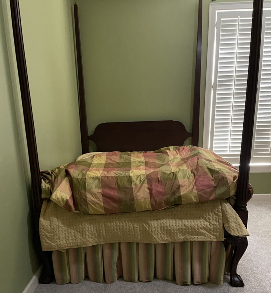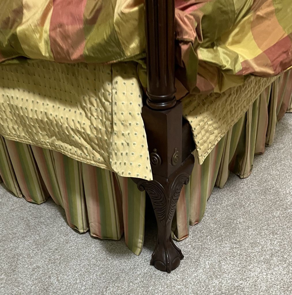 Pair of Chippendale Style Double Beds, hand crafted over 50 years ago in Natchez Ms, Mahogany, old square head bolts, one bed is missing finials, includes bedding. Beds Are disassembled. Pair of Chippendale Style Double Beds, hand crafted over 50 years ago in Natchez Ms, Mahogany, old square head bolts, one bed is missing finials, includes bedding. Beds Are disassembled.