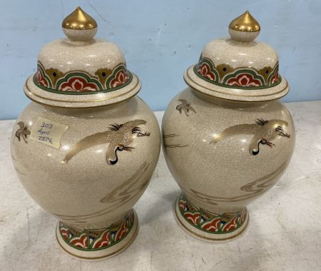 Pair of Andrea by Sadek Japanese Vases, cranes, 12"h. Location Front White Shelves, 3rd shelf Pair of Andrea by Sadek Japanese Vases, cranes, 12"h. Location Front White Shelves, 3rd shelf