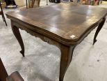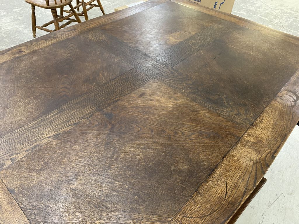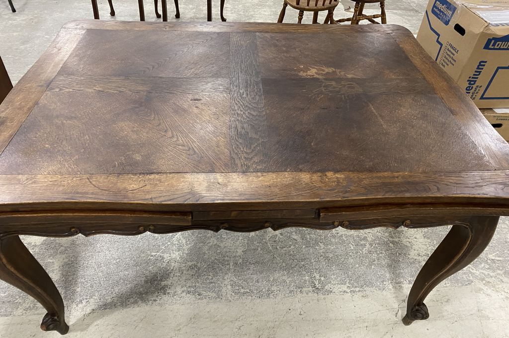 French Style Oak Pub Table, has some worn spots on top, 31"h., 59"w., 43"w. Location: Left Side 6th Row French Style Oak Pub Table, has some worn spots on top, 31"h., 59"w., 43"w. Location: Left Side 6th Row