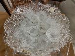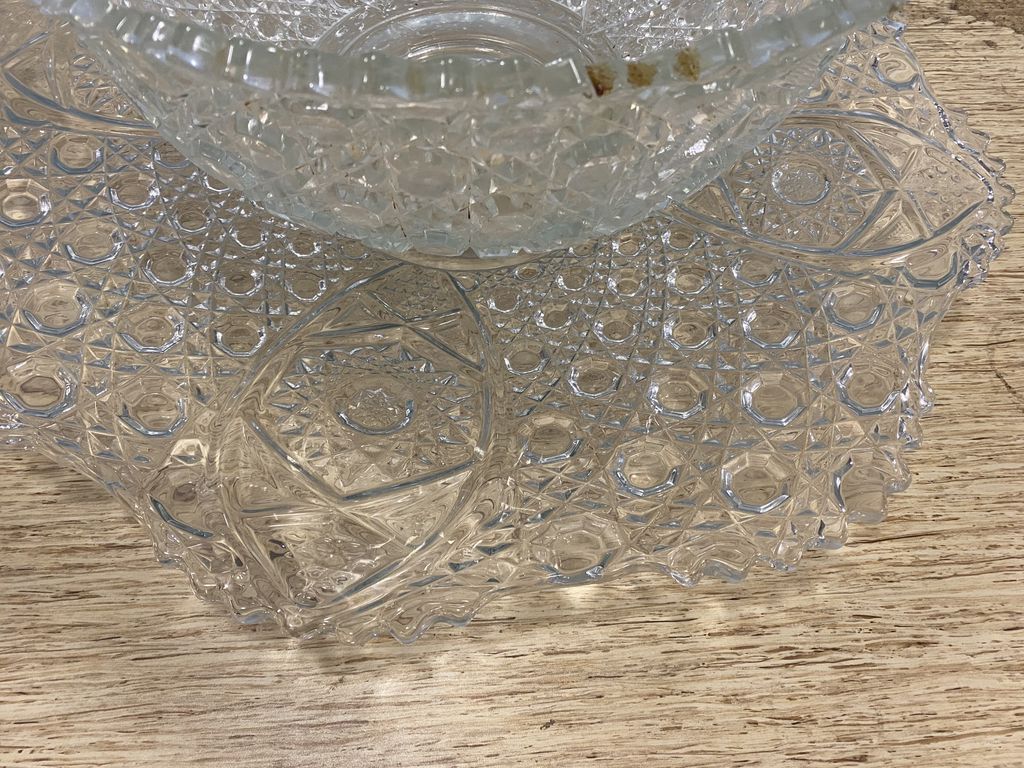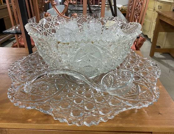 Vintage L.E. Smith Daisy & Button Pressed Glass Punch Bowl 7"h., 16"dia., and underplate, includes punch cups, 23"w. Location Right Side 1st Rows Vintage L.E. Smith Daisy & Button Pressed Glass Punch Bowl 7"h., 16"dia., and underplate, includes punch cups, 23"w. Location Right Side 1st Rows