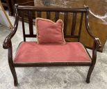 Vintage Mahogany Bench, pink upholstery, scratches on finish, 43"w. Location Front of Screen Vintage Mahogany Bench, pink upholstery, scratches on finish, 43"w. Location Front of Screen