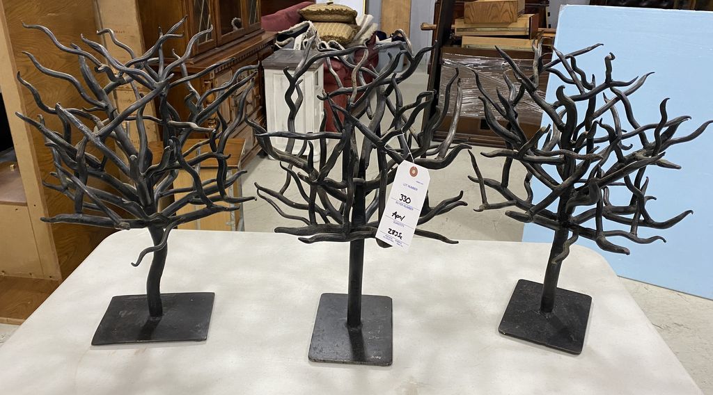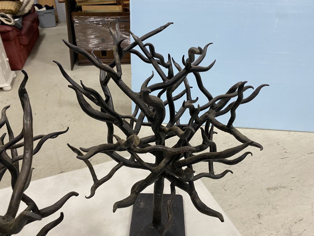 Three Iron Sculpture Trees, heavy, hand crafted, 22"h. Location: Black Silver Metal Shelves Three Iron Sculpture Trees, heavy, hand crafted, 22"h. Location: Black Silver Metal Shelves