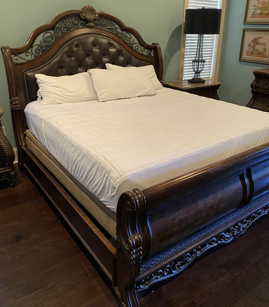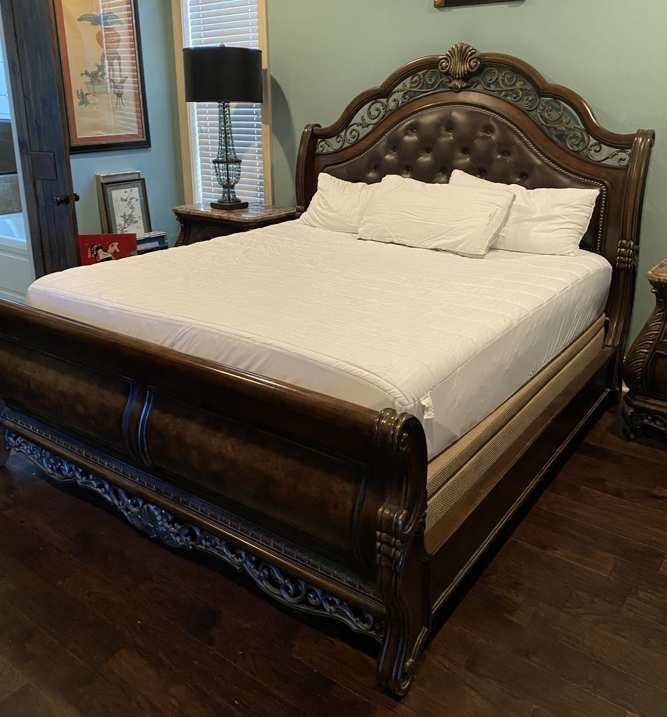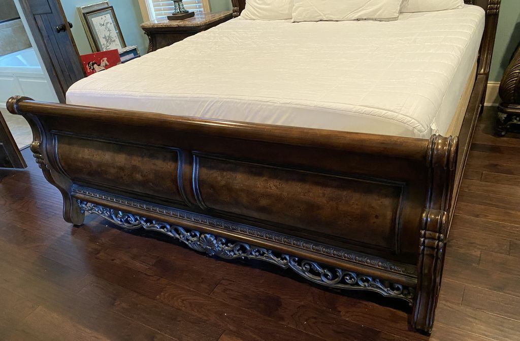 Pulaski Furniture Birkhaven King Size Bed, has rails, footboard, mattress no included. Lush mocha with silver and gold highlights, Mappa Burl and Birch veneers, Marble veneered, Bombe shaping, Miskelly Furniture, Location Left Wall Pulaski Furniture Birkhaven King Size Bed, has rails, footboard, mattress no included. Lush mocha with silver and gold highlights, Mappa Burl and Birch veneers, Marble veneered, Bombe shaping, Miskelly Furniture, Location Left Wall