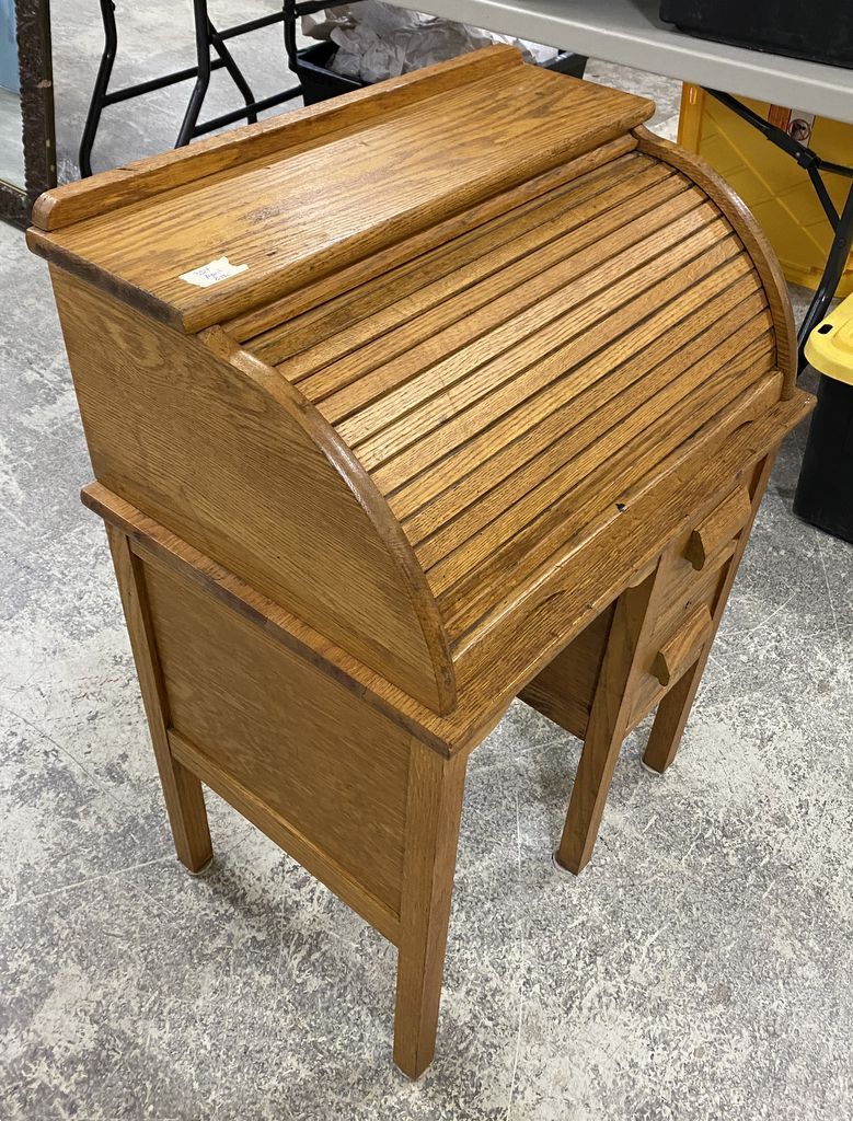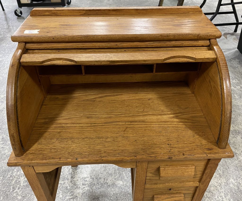 Child's Small Oak Roll Top Desk, c roll, good condition, 33"h., 23"w. Location Right Side 2n Row Child's Small Oak Roll Top Desk, c roll, good condition, 33"h., 23"w. Location Right Side 2n Row