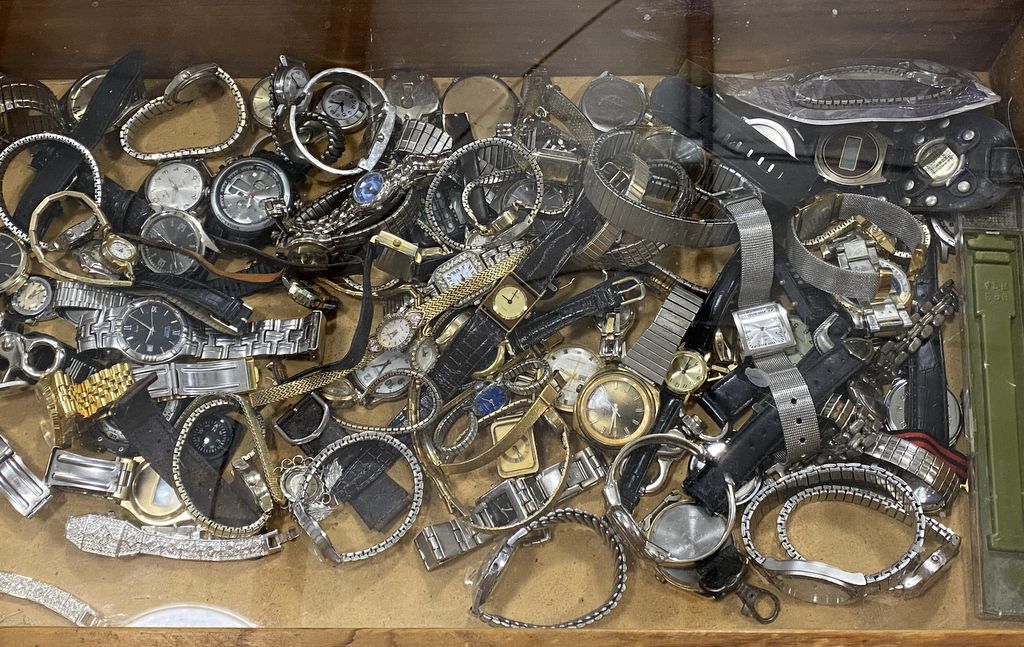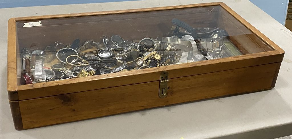 Display Box with Assortment of Men's and Ladies Watches, box is 25"wide. Location Center Front Showcases Display Box with Assortment of Men's and Ladies Watches, box is 25"wide. Location Center Front Showcases