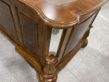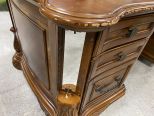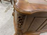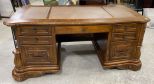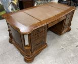 Michael Amini by AICO Excelsior Executor Office Desk, large, leather top, has worn wear on edges, two polyfoam side doors needs repair, 30"h. 70"long, 35"w. Michael Amini by AICO Excelsior Executor Office Desk, large, leather top, has worn wear on edges, two polyfoam side doors needs repair, 30"h. 70"long, 35"w.