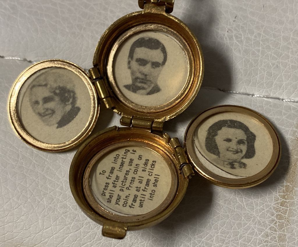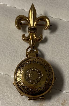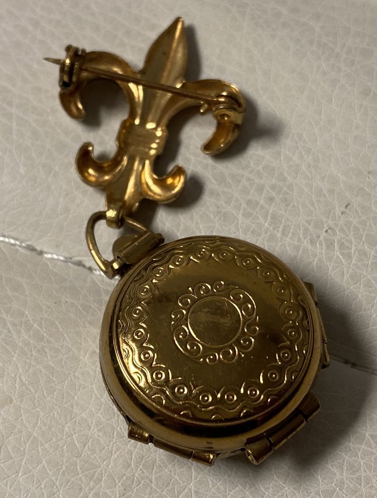 Signed Vintage Coro 4 Picture Locket, with fleur de lis, 2 1/4", Location: Wood Slant Showcase Signed Vintage Coro 4 Picture Locket, with fleur de lis, 2 1/4", Location: Wood Slant Showcase
