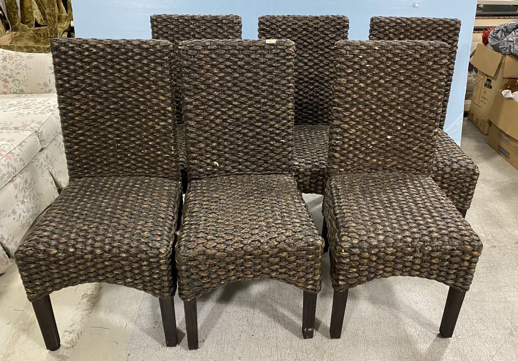 Six Water Hyacinth Dining Chairs, several have wear. Location: Left Side 4th Row, Ross Furniture. Six Water Hyacinth Dining Chairs, several have wear. Location: Left Side 4th Row, Ross Furniture.