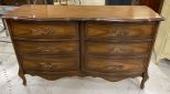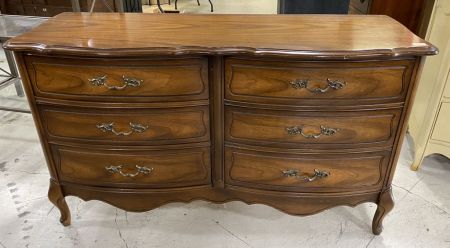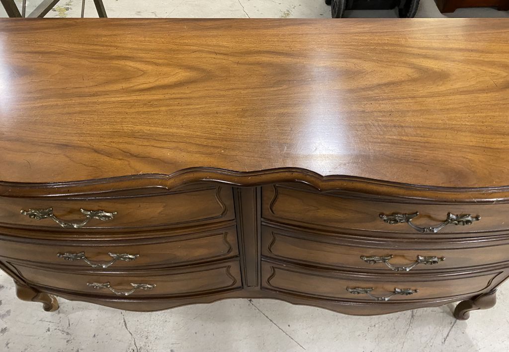 French Provincial Style Double Dresser, 6 drawers, walnut finish, light wear, 32"h., 55"w., 19"d. Location Right Side 1st Rows French Provincial Style Double Dresser, 6 drawers, walnut finish, light wear, 32"h., 55"w., 19"d. Location Right Side 1st Rows