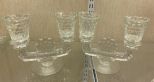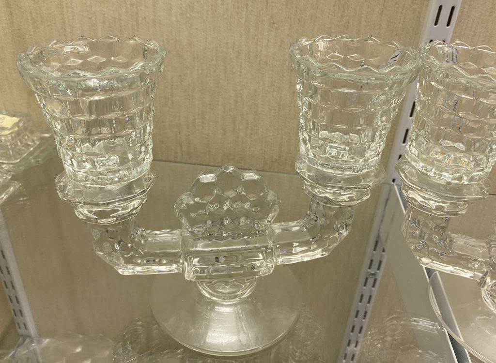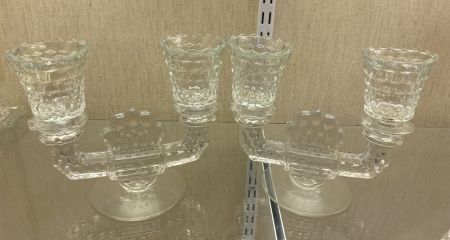 Pair of Fostoria American Clear Double Fan Pattern Candle Holders, with glass shades, 7 1/2"h. Location Back Tall White Cases Pair of Fostoria American Clear Double Fan Pattern Candle Holders, with glass shades, 7 1/2"h. Location Back Tall White Cases