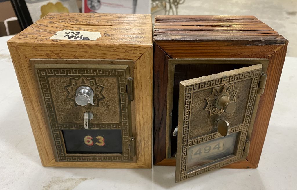 Two Vintage Post Office Lock Boxes, no. 494, 63, wood case, 6 1/2"h. ,5"w. Location: Back White Cases Two Vintage Post Office Lock Boxes, no. 494, 63, wood case, 6 1/2"h. ,5"w. Location: Back White Cases
