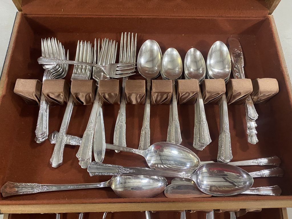 WM Rogers Overlaid IS Flatware, knives, spoons, forks, serving pieces, including box. Location Front White Shelves, 1st shelf WM Rogers Overlaid IS Flatware, knives, spoons, forks, serving pieces, including box. Location Front White Shelves, 1st shelf